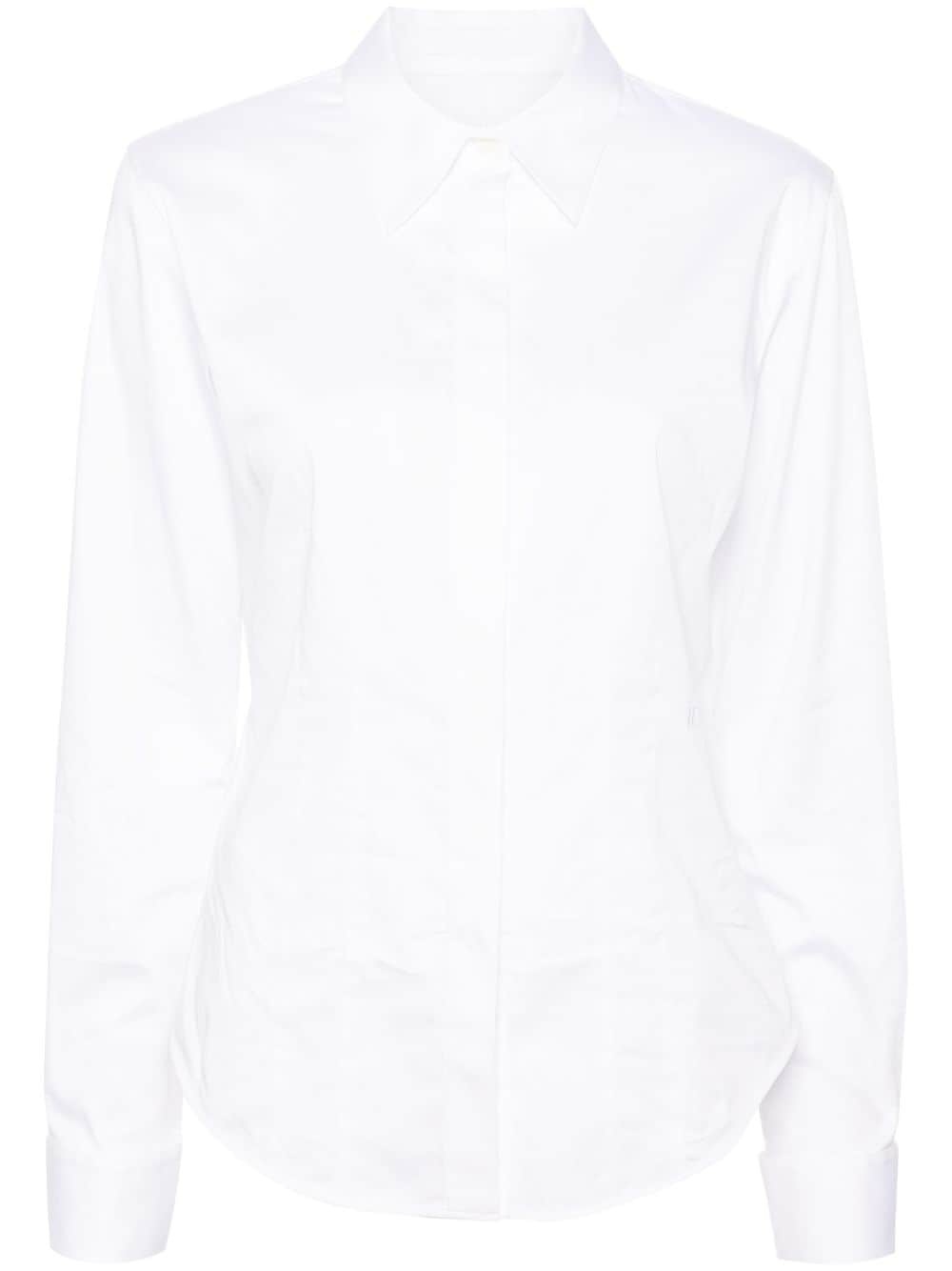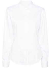 classic-collar poplin shirt Highlights - White - Cotton blend - Poplin texture - Embroidered logo to the side - Dart detailing - Classic collar - Concealed front button fastening - Long sleeves - Buttoned cuffs - Curved hem Imported Composition Cotton 97%, Elastane 3% SIZE & FIT Model measurements Height 5 ft 10 in(1.78 m) Bust/Chest 33.07 in(84 cm) Hips 36.61 in(93 cm) Waist 24.8 in(63 cm) FittingInformation Designed for a slim fit that sits just away from the body offering a close yet comfortable fit The dart stitching adds structure and a closer fit in the torso of this piece Made from a midweight stretch fabric, this piece offers elasticity and flexibility when worn This piece fits true to size – take your usual size