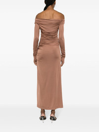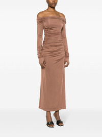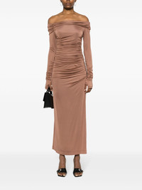 off-shoulder draped maxi dress Highlights - Rust brown - Stretch-jersey - Ruched detailing - Off-shoulder - Long sleeves - Draped detailing at the waist - Tonal stitching Imported Composition Outer: Viscose 97%, Spandex/Elastane 3% Lining: Polyester 100% SIZE & FIT Model measurements Height 5 ft 11 in(1.8 m) Bust/Chest 31.49 in(80 cm) Hips 36.61 in(93 cm) Waist 24.4 in(62 cm) FittingInformation Designed for a close fit throughout Made from a midweight stretch fabric, this piece offers elasticity and flexibility when worn This piece fits true to size – take your usual size Washing instructions Machine Wash