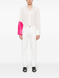 patchwork silk shirt Highlights - White/fuchsia pink - Silk - Chiffon crepe - Straight-point collar - Long sleeves with buttoned cuffs - Patchwork detailing to the sleeve - Box-pleat detail to the rear - Curved hem - Front button fastening - When buying this unisex item, keep in mind that it is graded in standard men's sizing. Imported Composition Silk 100% Washing instructions Dry Clean Only