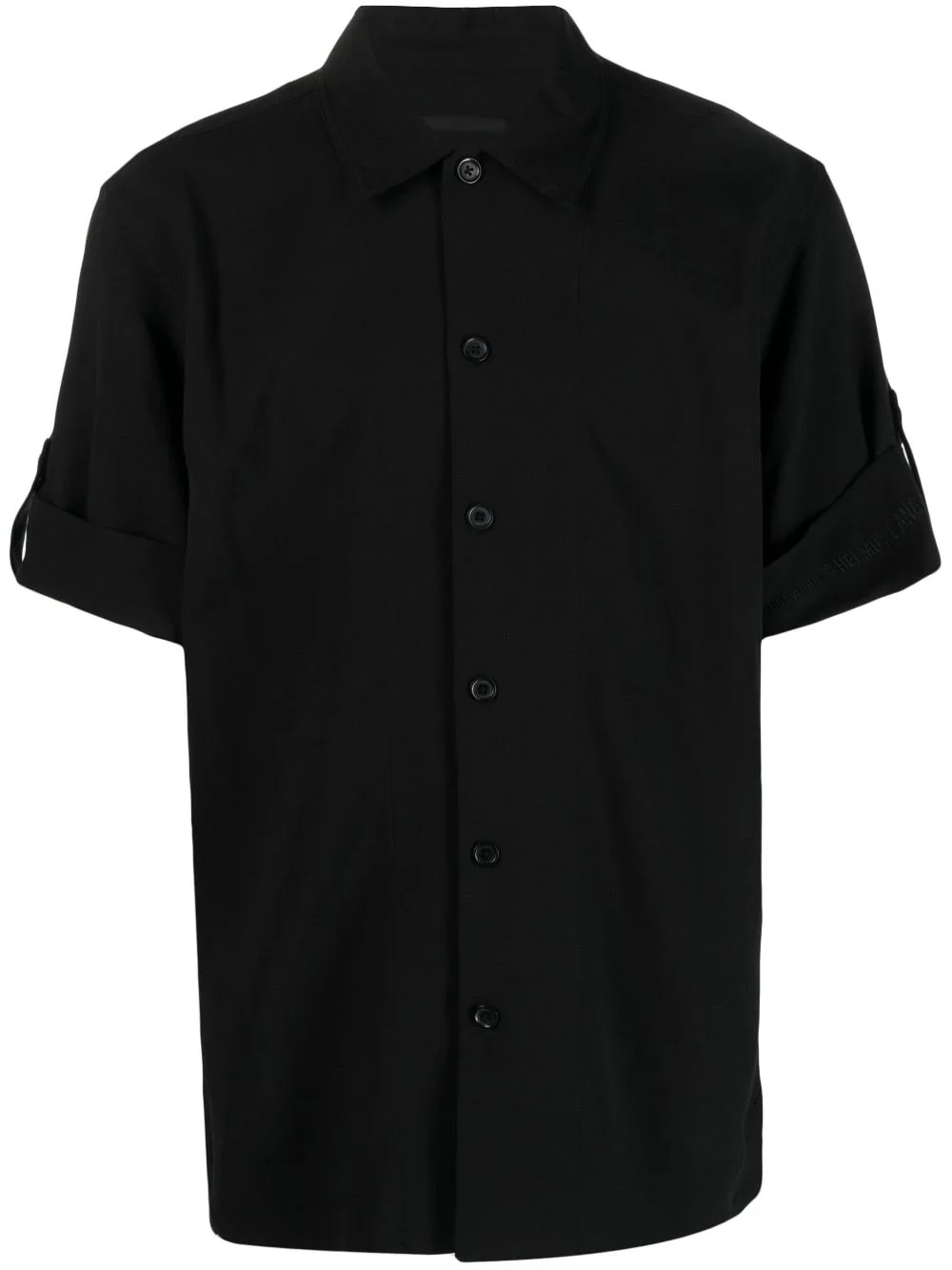 short-sleeve button-up shirt Highlights - Black - Classic collar - Front button fastening - Short sleeves - Turn-up cuffs - Straight hem Imported Composition Rayon 60%, Cotton 24%, Polyester 12%, Linen/Flax 4% SIZE & FIT Model measurements Height 6 ft 1 in(1.86 m) Bust/Chest 36.61 in(93 cm) Hips 37 in(94 cm) Waist 28.74 in(73 cm) FittingInformation Designed to be unstructured, offering a loose fit throughout Made from a midweight non-stretch fabric This piece fits true to size – take your usual size Measurement CHEST 42 in(106.7 cm) SLEEVE LENGTH 9.01 in(22.9 cm) Shoulder Width 18.5 in(47 cm) LENGTH 29.01 in(73.7 cm) WAIST 40.98 in(104.1 cm) Washing instructions Dry Clean Only
