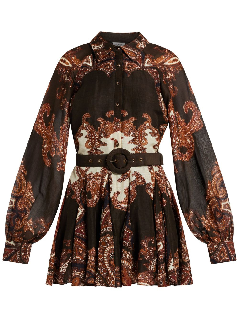 paisley-print mini dress Highlights - Cedar brown - Paisley print - Front button fastening - Belted waist - Classic collar - Long sleeves - Buttoned-cuff sleeves - Flared hem - Thigh-length Imported Composition Viscose 60%, Linen/Flax 40% Washing instructions Dry Clean Only