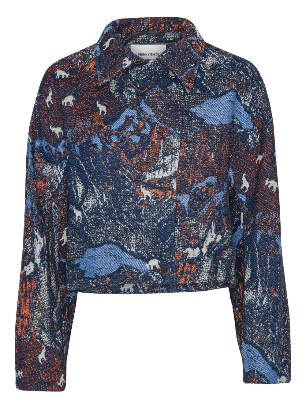 cotton-wool blend jacket Highlights - Blue - Tapestry weave - Animal print - Mountain landscape print - Button fastening - Long sleeves Imported Composition Recycled Polyester 30%, Cotton 26%, Wool 25%, Acrylic 8%, Polyamide 6%, Other fibres 5% Washing instructions Read Manufacturer Guidelines