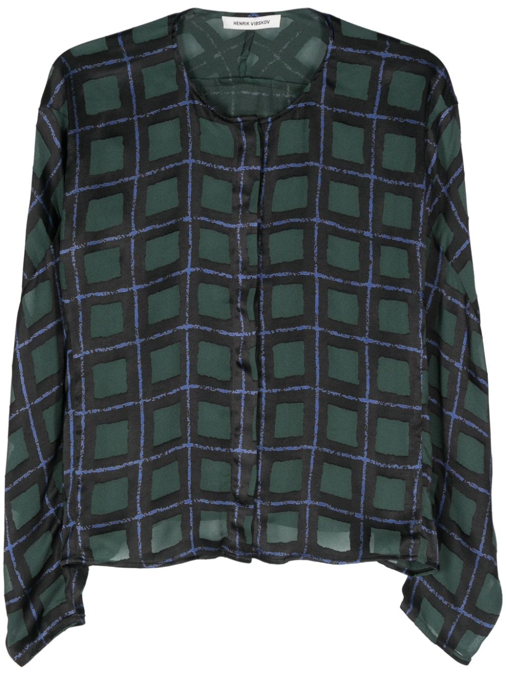 Dimness blouse Highlights - Black/green - Textured finish - Concealed front button fastening - Windowpane print - Round neck - Long sleeves - Straight hem Imported Composition Viscose 67%, Polyester 33%