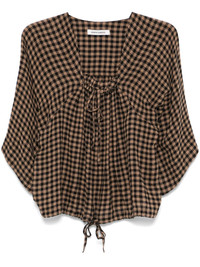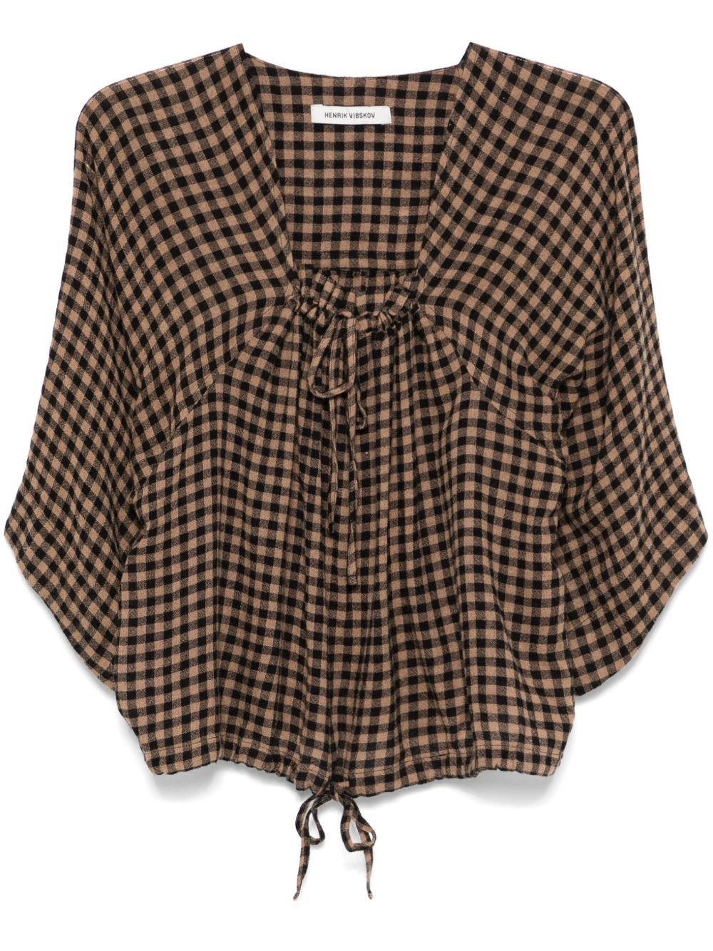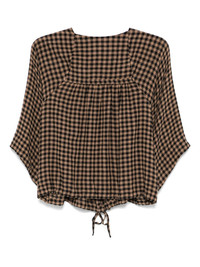 Frill blouse Highlights - Beige/black - Interlock weave - Gingham check pattern - Gathered tie neck - Crop sleeves - Drawstring hem Imported Composition EcoVero Viscose (LENZING) 70%, Wool 30%