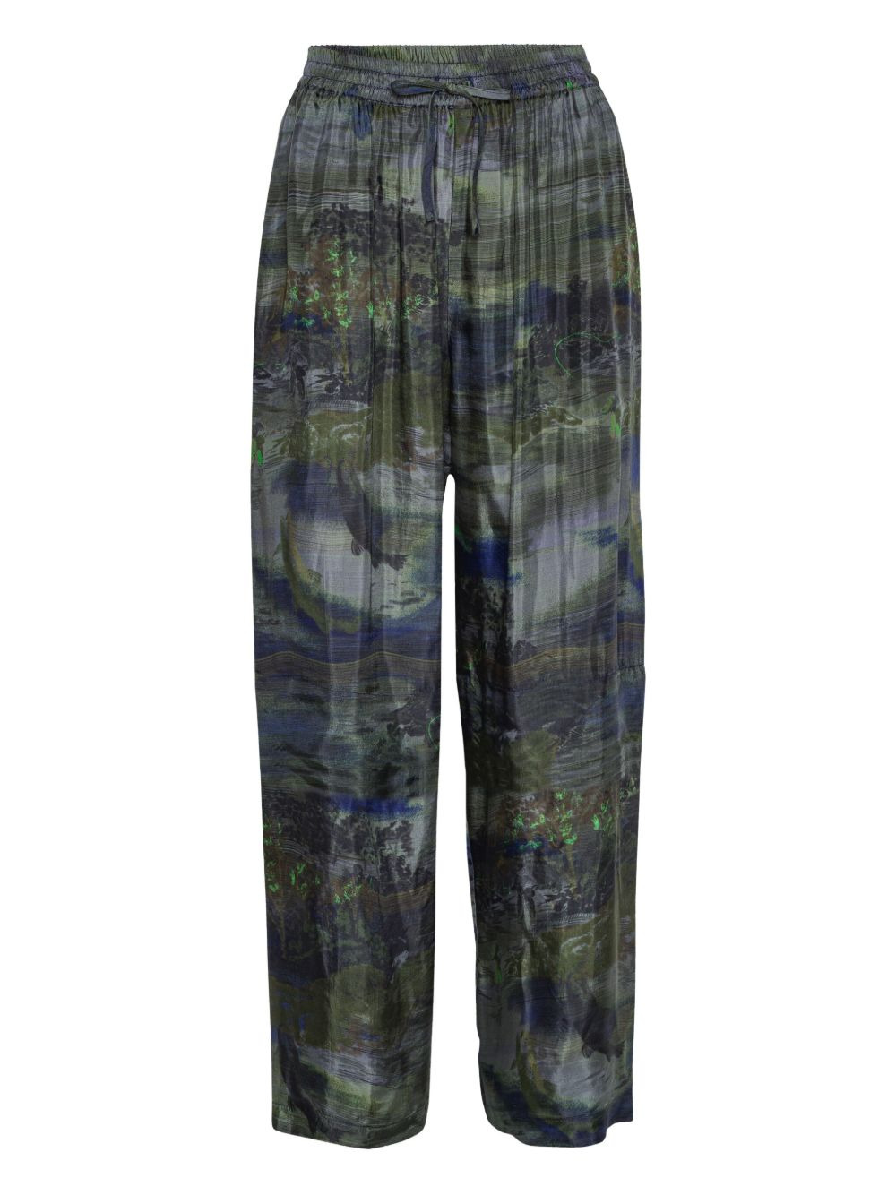 landscape-print drawstring straight trousers Highlights - Green - Landscape print - Drawstring fastening - Straight leg - Layered design - Elasticated waistband Imported Composition FSC Viscose 73%, Linen/Flax 13%, Polyester 13%, Elastane 1% Washing instructions Read Manufacturer Guidelines