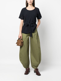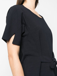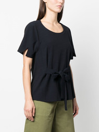 round-neck short-sleeve blouse midnight blue scoop neck short sleeves split cuffs tied waist straight hem Imported Composition Fabric 100% SIZE & FIT Model measurements Height 5 ft 10 in(1.77 m) Bust/Chest 35.03 in(89 cm) Hips 35.03 in(89 cm) Waist 23.62 in(60 cm) FittingInformation This piece fits true to size. We recommend you get your regular size Designed to be fitted at the waist and hips, loose over the leg Made with a mid-weight non-stretch fabric Washing instructions Dry Clean Only