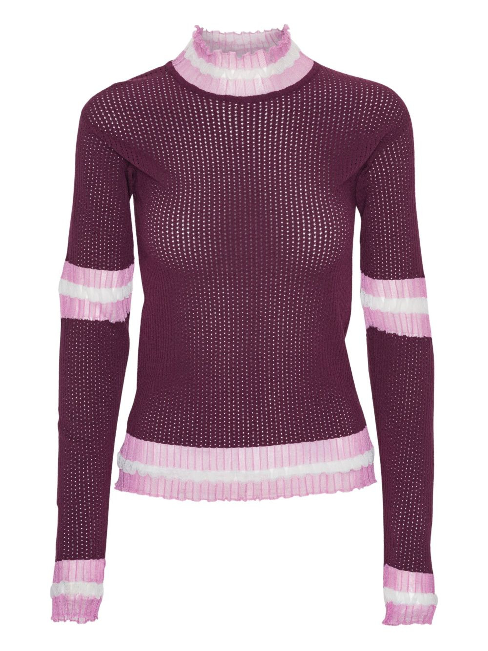 ruffled-trim perforated jumper Highlights - Pink - Perforated design - Ruffled trim - High neck - Long sleeves - Ribbed hem Imported Composition Fabric 100% Washing instructions Read Manufacturer Guidelines