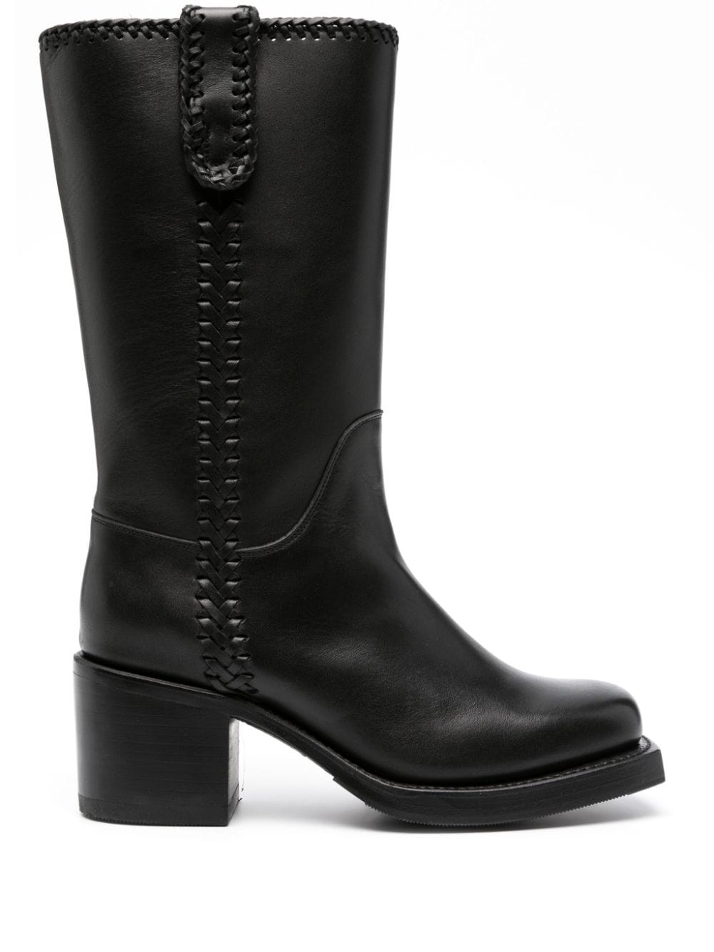 Aumandra 65mm leather boots Highlights - Black - Calf leather - Braid detailing - Square toe - Slip-on style - High block heel - Calf-length Imported Composition Lining: Calf Leather 100% Sole: Calf Leather 100%, Rubber 100% Outer: Calf Leather 100% SIZE & FIT Measurement CIRCUMFERENCE 12.59 in(32 cm) HEEL 2.55 in(6.5 cm) HEIGHT 10.62 in(27 cm) Sole height 0.59 in(1.5 cm)