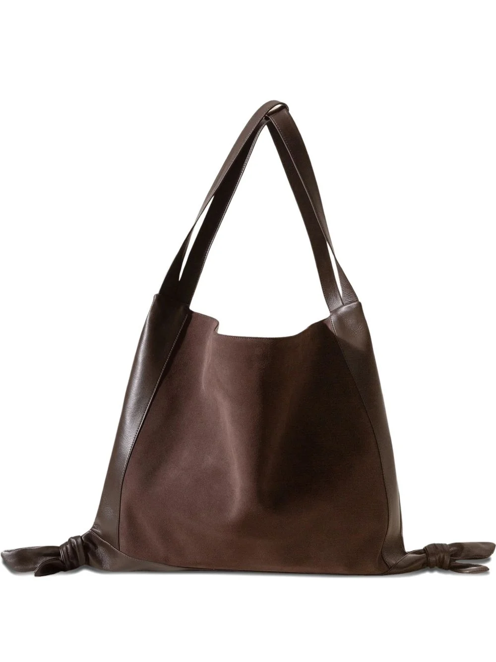 Cador suede knot shoulder bag Highlights - Dark brown - Suede - Knot detail - Top handle - Internal slip pocket Imported Composition Outer: Calf Suede 100%, Calf Leather 100% SIZE & FIT Measurement DEPTH 5.9 in(15 cm) HEIGHT 11.41 in(29 cm) WIDTH 13.77 in(35 cm)