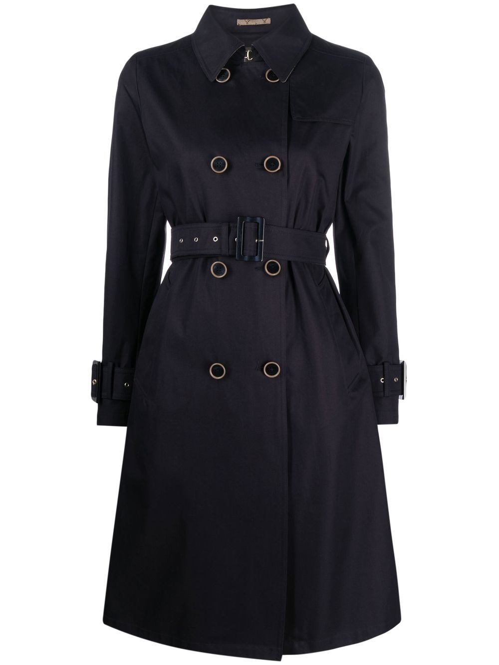 belted double-breasted trench coat navy blue cotton double-breasted button fastening belted waist belted cuffs inverted pleat two side welt pockets long sleeves straight hem knee-length Made in Italy Composition Lining: Cotton 100%, Acetate 65%, Polyester 35% Outer: Cotton 100% SIZE & FIT Model measurements Height 5 ft 9 in(1.75 m) Bust/Chest 31.49 in(80 cm) Hips 34.05 in(86.5 cm) Waist 24.21 in(61.5 cm) FittingInformation Designed for a slim fit that sits just away from the body offering a close yet comfortable fit The belt offers adjustability for fitted preferences Made from a midweight non-stretch fabric This piece fits true to size – take your usual size Washing instructions Dry Clean Only