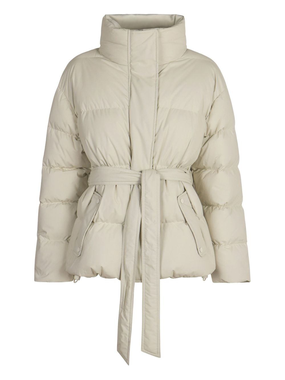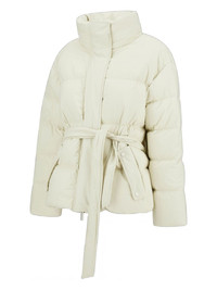 belted puffer jacket Highlights - Off-white - High neck - Long sleeves Imported Composition Lining: Polyester 100%, Down 80%, Feather 20% Outer: Polyester 100% Washing instructions Read Manufacturer Guidelines
