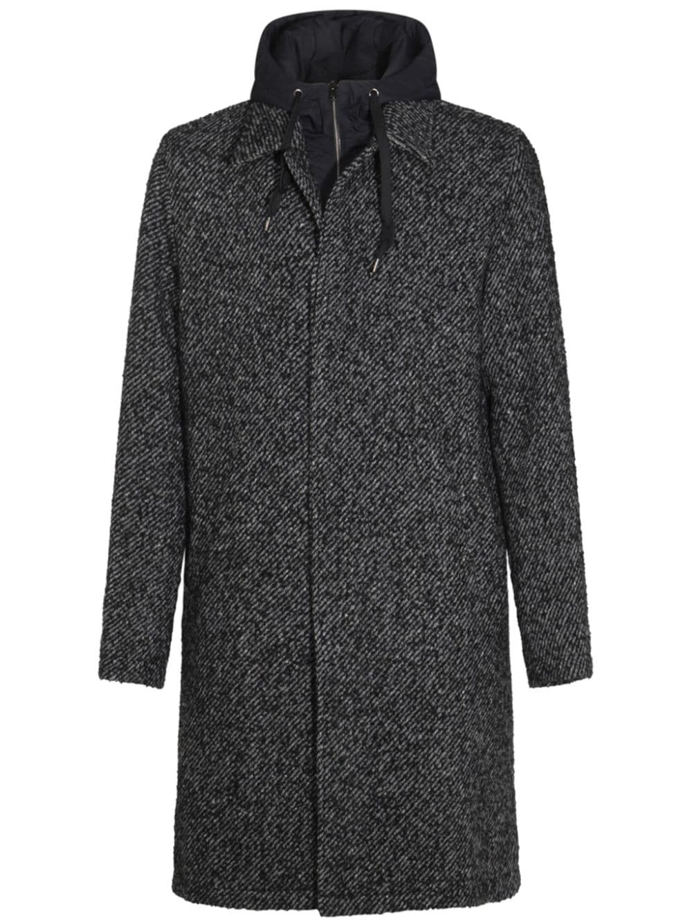 boucle coat Highlights - Black/grey - Twill weave - Boucle construction - Concealed front button fastening - Detachable panels - Drawstring hood - Spread collar - Long sleeves - Two side welt pockets - Full lining - Straight hem Made in Italy Composition Outer: Polyurethane 100%, Recycled Wool 37%, Acrylic 34%, Polyester 24%, Polyamide 3%, Other fibres 2% Lining: Polyamide 100%, Polyester 100%
