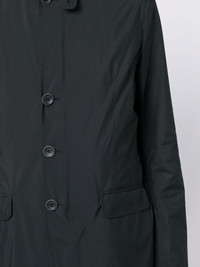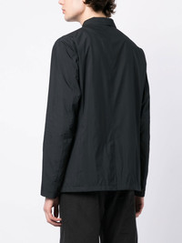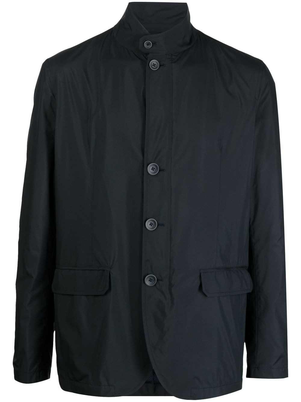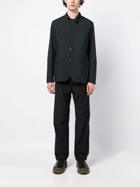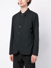 button-front bomber jacket midnight blue collarless front button fastening long sleeves two side flap pockets Made in Italy Composition Body: Polyester 100% Trims: Polyamide 85%, Elastane 15% Lining: Polyester 100% SIZE & FIT Model measurements Height 6 ft 3 in(1.9 m) Bust/Chest 34.64 in(88 cm) Hips 36.61 in(93 cm) Waist 27.55 in(70 cm) FittingInformation This piece fits true to size. We recommend you get your regular size Cut for a loose fit Made with a mid-weight non-stretch fabric Washing instructions Dry Clean Only
