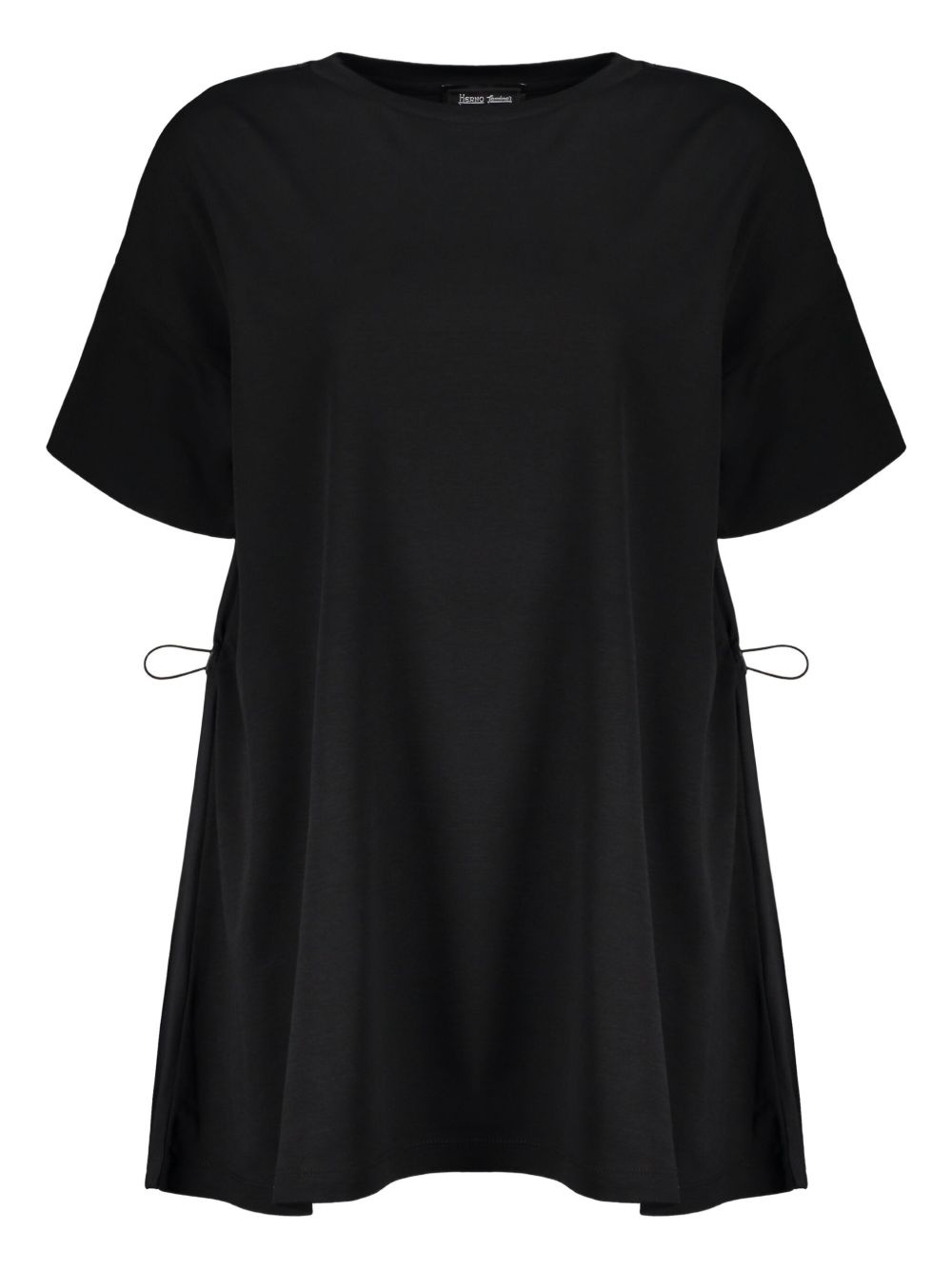 drawstring-waist T-shirt Highlights - Black - Crew neck - Short sleeves - Logo plaque - Pleat detailing Imported Composition Polyester 100%, Cotton 100%