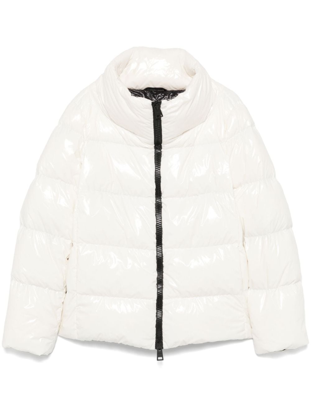 glossy puffer jacket Highlights - White - Goose down - Padded design - Glossy finish - Front two-way zip fastening - High neck - Long sleeves - Two side slit pockets - Full lining - Straight hem Imported Composition Lining: Polyamide 100%, Goose Down 80%, Goose Feather 20% Outer: Polyamide 100%, Polyvinyl Acetate (PVA) 100% SIZE & FIT Model measurements Height 5 ft 10 in(1.78 m) Bust/Chest 33.46 in(85 cm) Hips 36.22 in(92 cm) Waist 23.22 in(59 cm) FittingInformation Designed for a relaxed fit, this piece allows for comfort and movement when worn Made from a padded non-stretch fabric, giving it no natural elasticity
