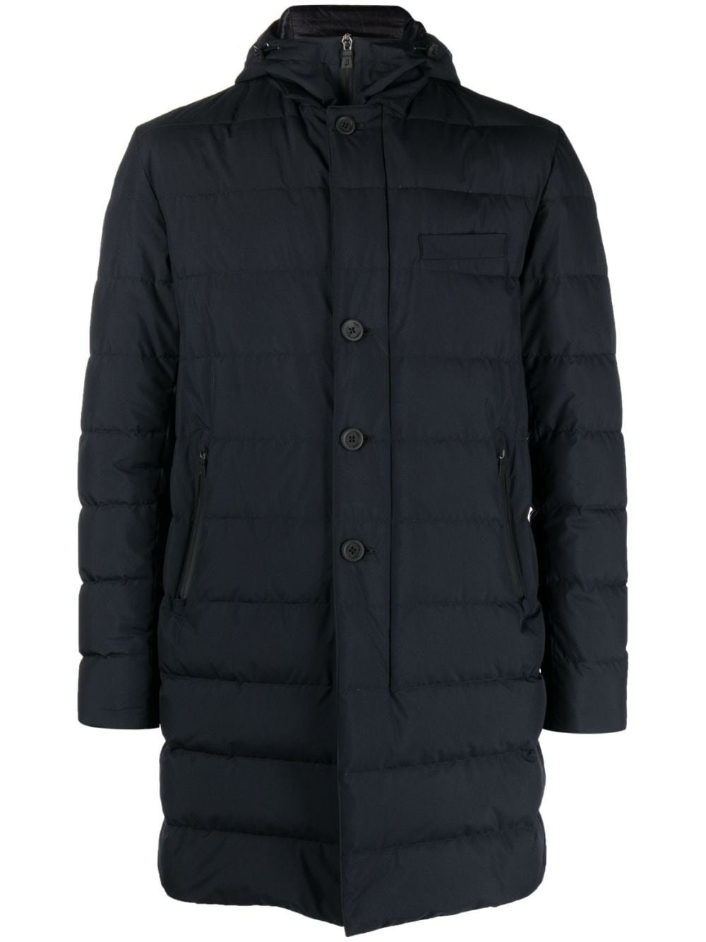 high-neck padded coat Highlights - Navy blue - Goose down - Padded design - Quilted - High neck - Drawstring hood - Front button and zip fastening - Long sleeves - Chest welt pocket - Front zip fastening pockets - Straight hem Imported Composition Outer: Polytetrafluoroethylene (PTFE) 100%, Polyester 100% Lining: Polyamide 100%, Polyester 100%, Goose Down 100% SIZE & FIT Model measurements Height 6 ft 2 in(1.87 m) Bust/Chest 38.18 in(97 cm) Hips 36.61 in(93 cm) Waist 29.13 in(74 cm) FittingInformation Designed for a slim fit, offering a comfortable fit that sits just away from the body Made from a padded non-stretch fabric, giving it no natural elasticity This piece fits true to size – take your usual size Washing instructions Hand Wash