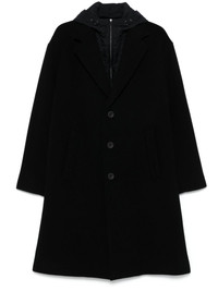 hooded coat Highlights - Black - Virgin wool blend - Detachable hood - Front button and zip fastening - Detachable panel - Notched lapels - Long sleeves - Two front welt pockets - Central rear vent - Full lining - Straight hem Made in Italy Composition Outer: Polyurethane 100%, Virgin Wool 75%, Polyamide 25% SIZE & FIT Model measurements Height 6 ft 2 in(1.87 m) Bust/Chest 37.79 in(96 cm) Hips 37.79 in(96 cm) Waist 30.31 in(77 cm) FittingInformation Designed to be unstructured, offering a loose fit throughout The detachable panel offers the preference for a different fit Made from a midweight non-stretch fabric