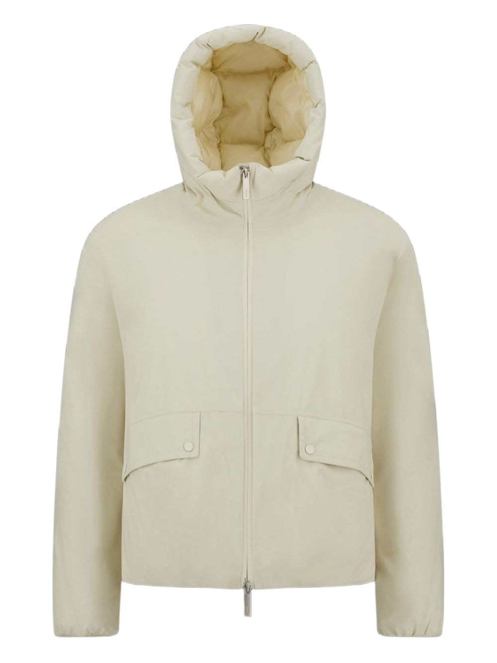 hooded flap-pocket jacket Highlights - Off-white - Hooded neckline - Zip fastening - Two flap pockets - Drawstring hem - Long sleeves Imported Composition Lining: Down 80%, Feather 20% Outer: Polyamide 100% Washing instructions Read Manufacturer Guidelines