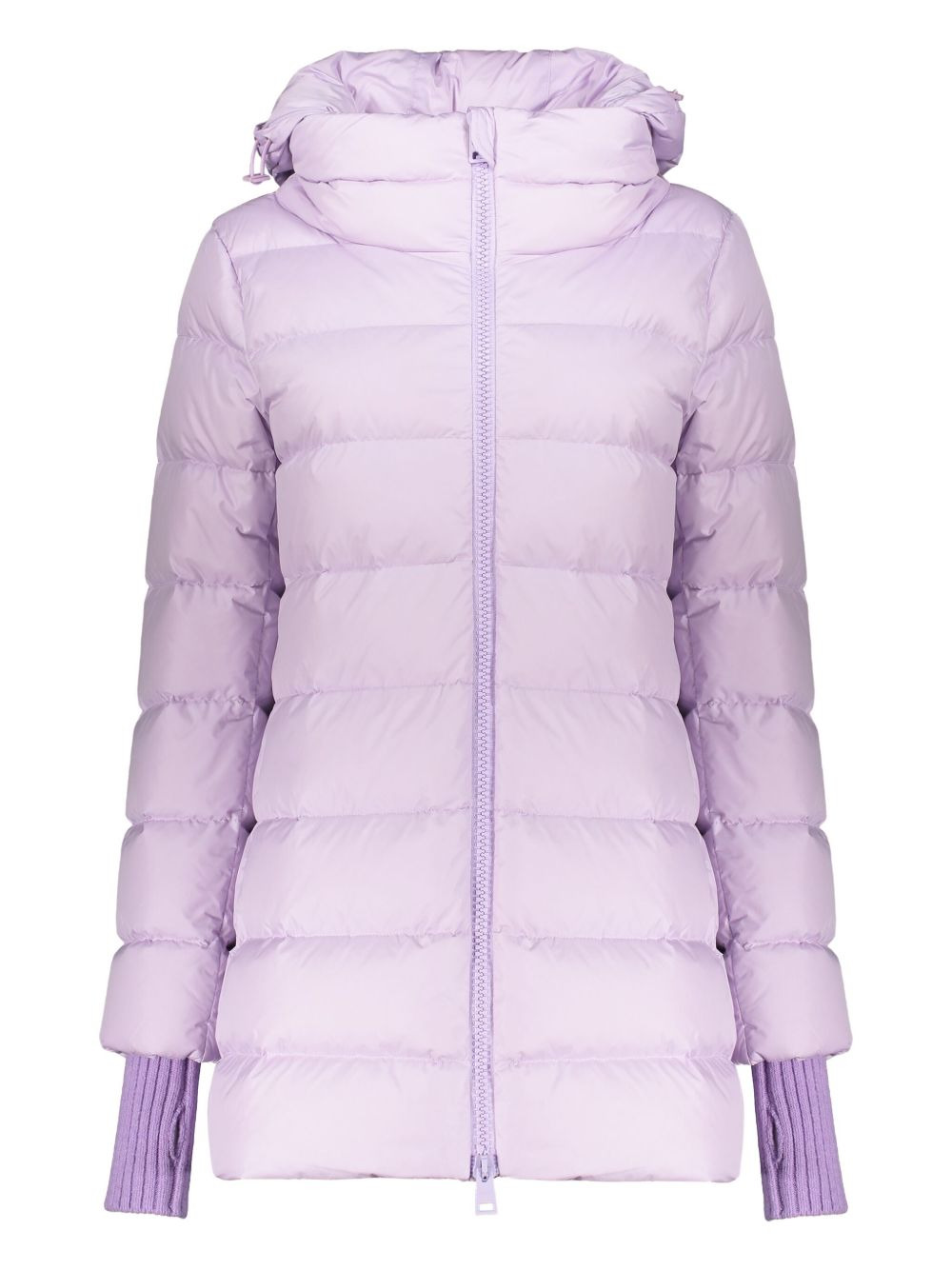 hooded knit-insert down jacket Highlights - Lilac purple - Goose down padding - Two-way zip closure - Ribbed knit cuffs - Quilted design - Hooded neckline Imported Composition Outer: Polyamide 100% Filling: Down 80%, Feather 20% Washing instructions Read Manufacturer Guidelines
