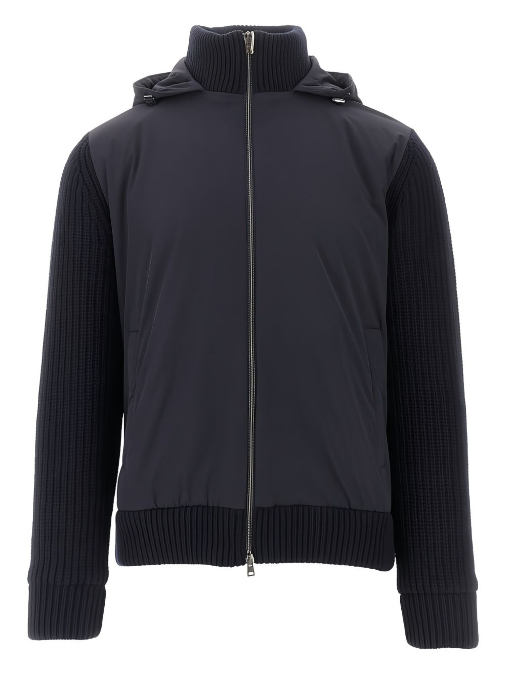 hooded knitted-sleeve jacket Highlights - Navy blue - Hooded neckline - Zip-front fastening - Knitted sleeves - Ribbed hem Made in Italy Composition Virgin Wool 100%, Polyamide 86%, Elastane 14% Washing instructions Read Manufacturer Guidelines