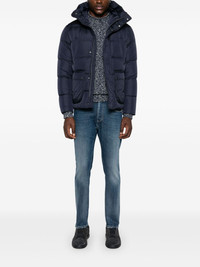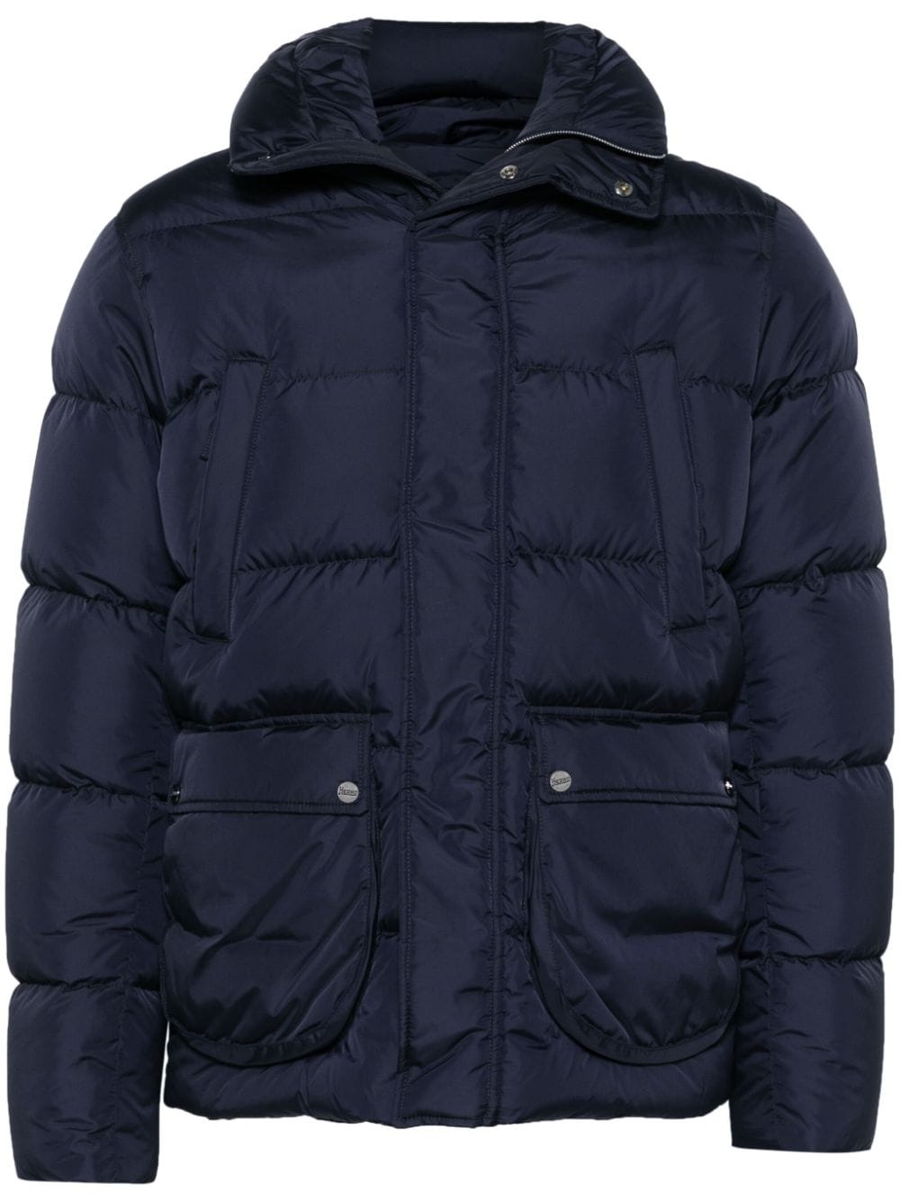 hooded puffer jacket Highlights - Navy blue - Goose down - Padded design - Classic hood - Front press-stud and zip fastening - High neck - Long sleeves - Two zip-fastening chest pockets - Two front flap pockets - Full lining - Drawstring hem Imported Composition Polyester 100%, Polyamide 100%, Goose Down 80%, Goose Feather 20% SIZE & FIT Model measurements Height 6 ft 2 in(1.89 m) Bust/Chest 39.76 in(101 cm) Hips 37.4 in(95 cm) Waist 29.92 in(76 cm) FittingInformation Designed for a regular fit, allowing for a comfortably loose fit throughout the body The internal drawstring at the hem allows for fitted preferences Made from a padded non-stretch fabric, giving it no natural elasticity