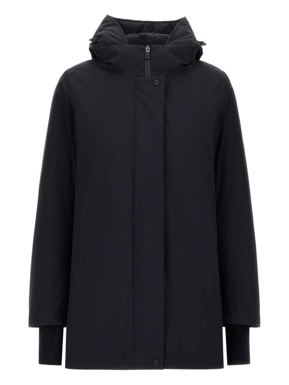 hooded puffer jacket Highlights Imported Composition Outer: Polyester 100%, Polyurethane 100% Lining: Polyamide 100%, Down 80%, Feather 20%