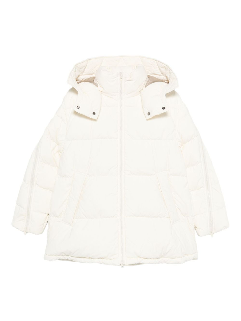 hooded quilted jacket Highlights - Off-white - Quilted design - Zip fastening - Hooded neckline - Long sleeves - Side zip pockets Imported Composition Polyamide 100% SIZE & FIT Model measurements Height 5 ft 9 in(1.75 m) Bust/Chest 34.64 in(88 cm) Hips 36.61 in(93 cm) Waist 26.37 in(67 cm) Washing instructions Read Manufacturer Guidelines