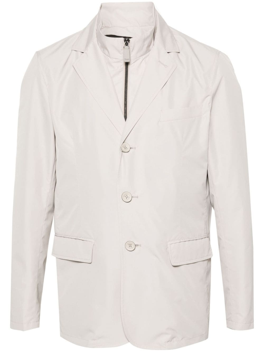 Byron layered single-breasted blazer Highlights - Light beige - Shell - Water-repellent - Lightweight - Layered design - Notched lapels - Long sleeves - Chest welt pocket - Two side flap pockets - Internal zip-fastening pocket - Full lining - Front button fastening Made in Italy Composition Polyurethane 100% Outer: Polyester 100% Lining: Polyester 100%, Cupro 100% SIZE & FIT Model measurements Height 6 ft 2 in(1.87 m) Bust/Chest 37.79 in(96 cm) Hips 37.79 in(96 cm) Waist 30.31 in(77 cm) FittingInformation Designed for a regular fit, allowing for a comfortably loose fit throughout the body The detachable panel offers the preference for a different fit Made from a lightweight non-stretch fabric This piece fits true to size – take your usual size Washing instructions Dry Clean Only