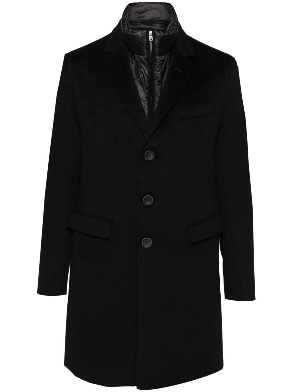 layered single-breasted coat Highlights - Black - Cashmere - Brushed effect - Layered design - Quilted panels - Dart detailing - Funnel neck - Notched lapels - Front button and zip fastening - Long sleeves - Buttoned cuffs - Chest welt pocket - Two side flap pockets - Straight hem - Quilted lining Made in Italy Composition Outer: Cashmere 100%, Polyamide 100% Lining: Polyamide 100%, Polyester 100% SIZE & FIT Model measurements Height 6 ft 2 in(1.87 m) Bust/Chest 36.41 in(92.5 cm) Hips 37 in(94 cm) Waist 29.52 in(75 cm) FittingInformation Designed for a slim fit, offering a comfortable fit that sits just away from the body The detachable panel offers the preference for a different fit Made from a midweight non-stretch fabric This piece fits true to size – take your usual size