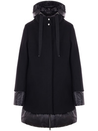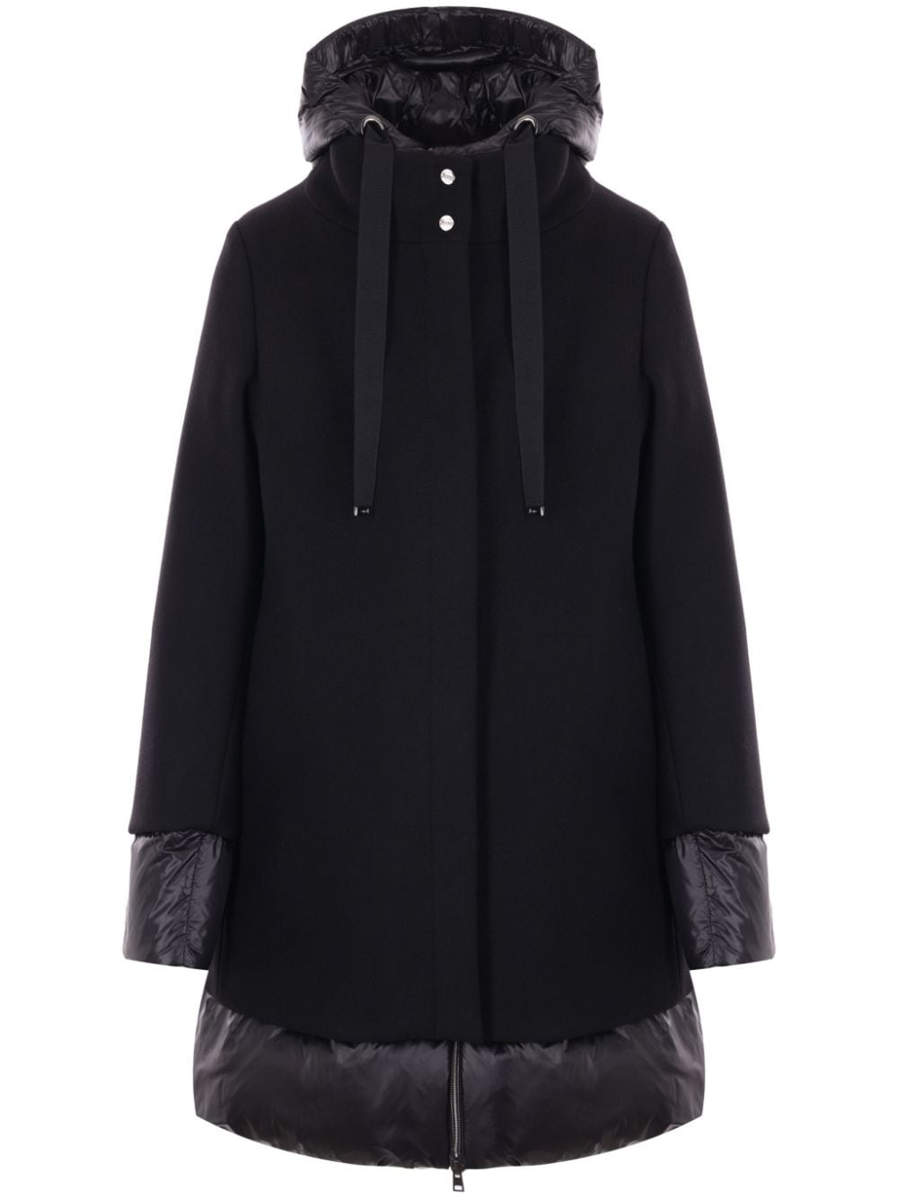 A-line lightweight coat Highlights - Black - Virgin wool blend - Long sleeves - High neck - Front zip fastening - Front press-stud fastening - Drawstring hood - Straight hem Made in Italy Composition Outer: Virgin Wool 75%, Polyamide 25% Lining: Polyamide 100%, Feather Down 100% SIZE & FIT FittingInformation Designed to be fitted across the shoulders, becoming looser as it falls Made from a padded non-stretch fabric, giving it no natural elasticity