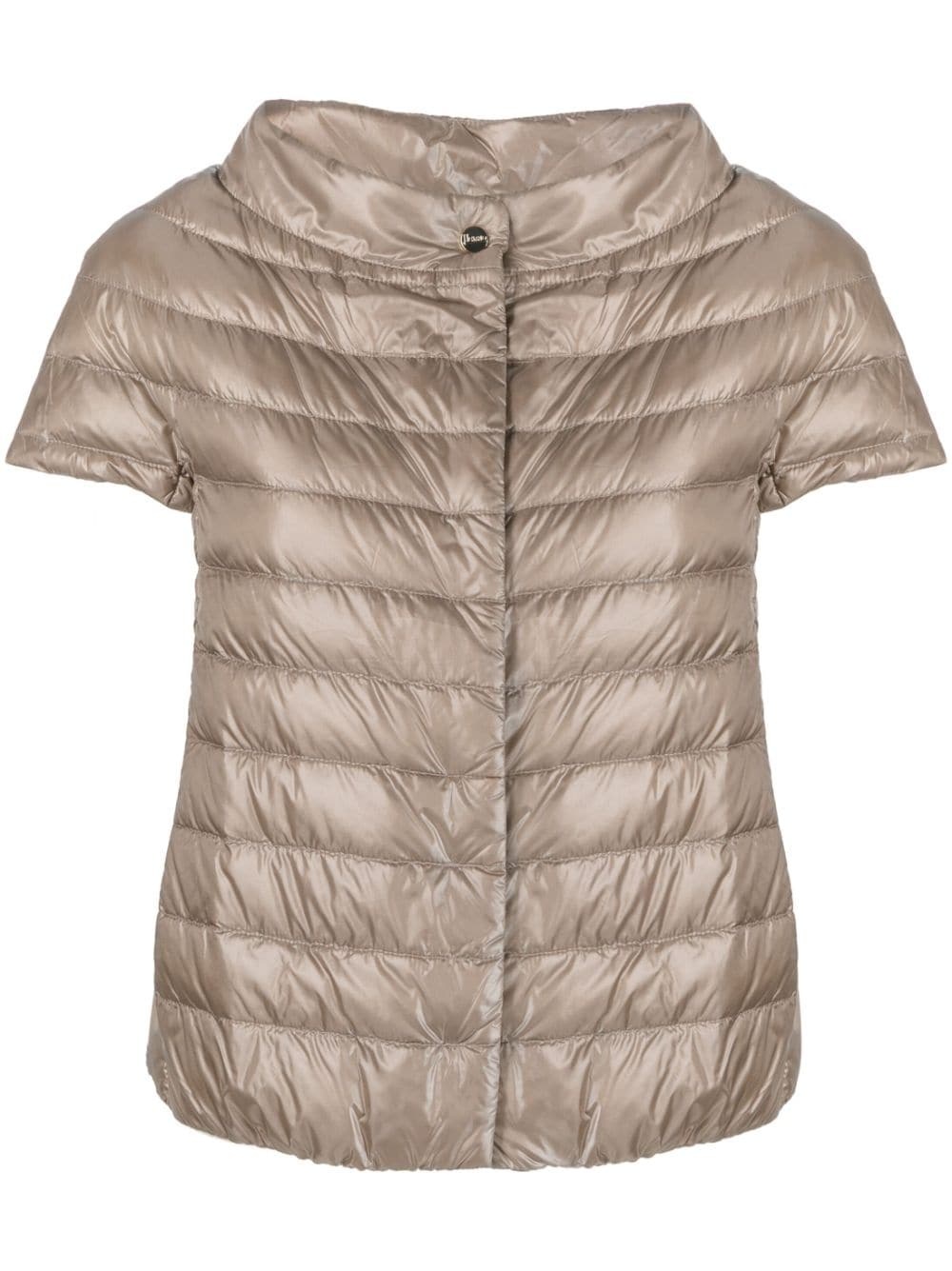 Margherita short-sleeve quilted jacket Herno combines innovative techniques and Italian craftsmanship to create its unique outerwear. An ideal transitional layering piece, this short-sleeve Margherita jacket is filled with insulating down. Highlights - Taupe brown - Down-feather filling - Quilted - Padded design - Round neck - Concealed press-stud fastening - Short sleeves - Two side welt pockets - Straight hem Imported Composition Lining: Polyamide 100%, Goose Down 100% Outer: Polyamide 100%, Cotton 55%, Polyester 45% Washing instructions Hand Wash