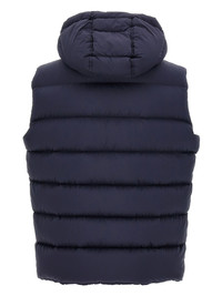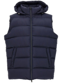 padded gilet Highlights - Navy blue - Front two-way zip fastening - Drawstring hood - Two side welt pockets - Sleeveless Imported Composition Outer: Polyamide 100%, Polyurethane 100% Lining: Polyamide 100%, Polyurethane 100%, Down 90%, Feather 10% SIZE & FIT FittingInformation Designed for a regular fit, allowing for a comfortably loose fit throughout the body The internal drawstring at the hem allows for fitted preferences Made from a padded non-stretch fabric, giving it no natural elasticity