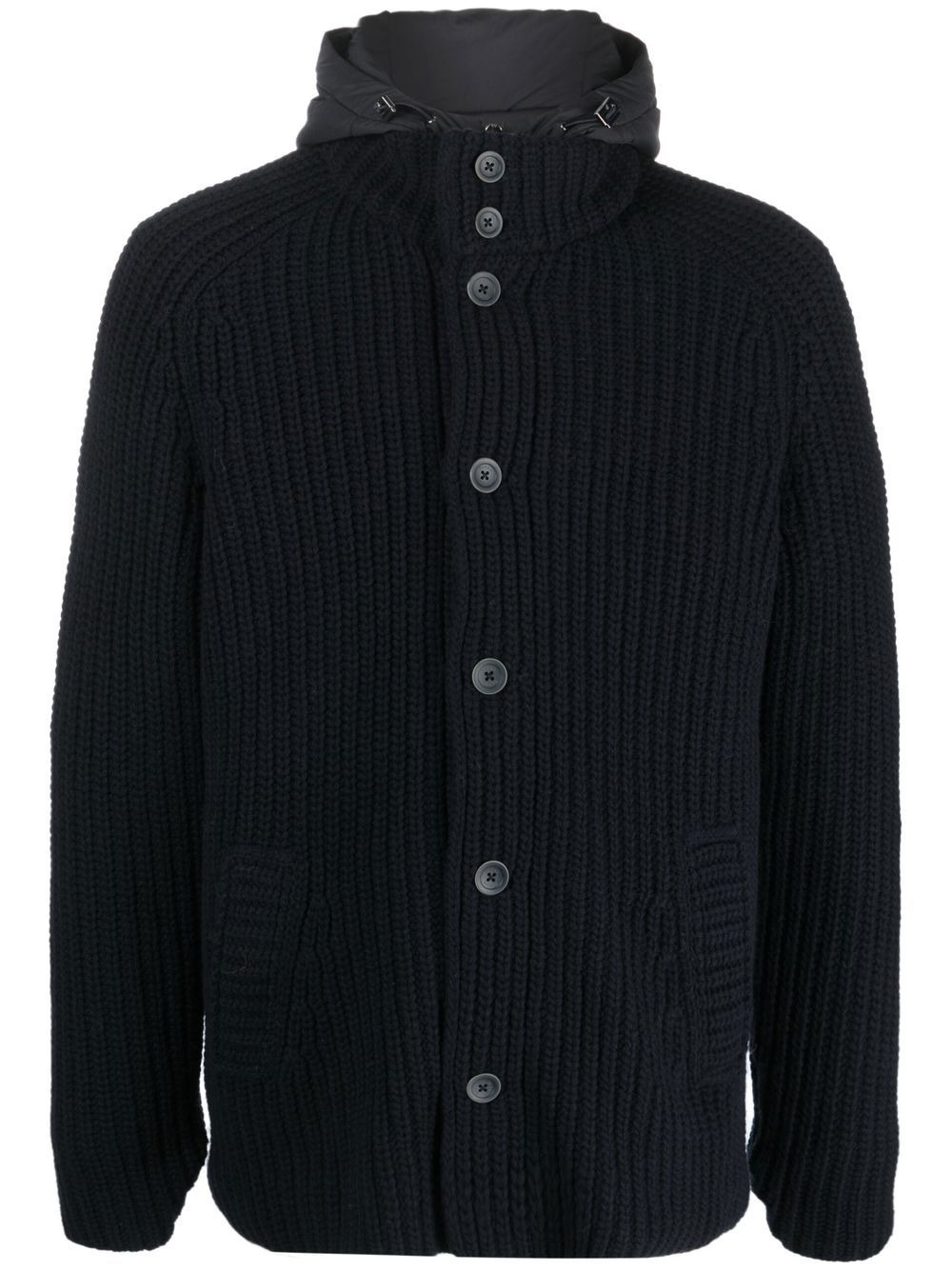 padded-hoot knit jacket Highlights - Navy blue - Wool - Classic hood - Chunky knit - Front button fastening - Long sleeves - Straight hem Made in Italy Composition Outer: Polyester 100%, Wool 100% Lining: Polyamide 100% SIZE & FIT Model measurements Height 6 ft 2 in(1.88 m) Bust/Chest 36.61 in(93 cm) Hips 37.79 in(96 cm) Waist 28.74 in(73 cm) FittingInformation This piece fits true to size. We recommend you get your regular size Cut for a loose fit Made with a mid-weight fabric Washing instructions Hand Wash