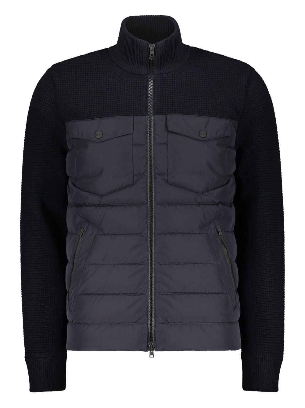 padded-panel knitted jacket Highlights - Dark blue - Padded front panels - Zip front fastening - Zip pockets - Flap pockets Imported Composition Lining: Goose Down 90%, Goose Feather 10% Outer: RWS Virgin Wool 50%, Polyester 50% Washing instructions Read Manufacturer Guidelines