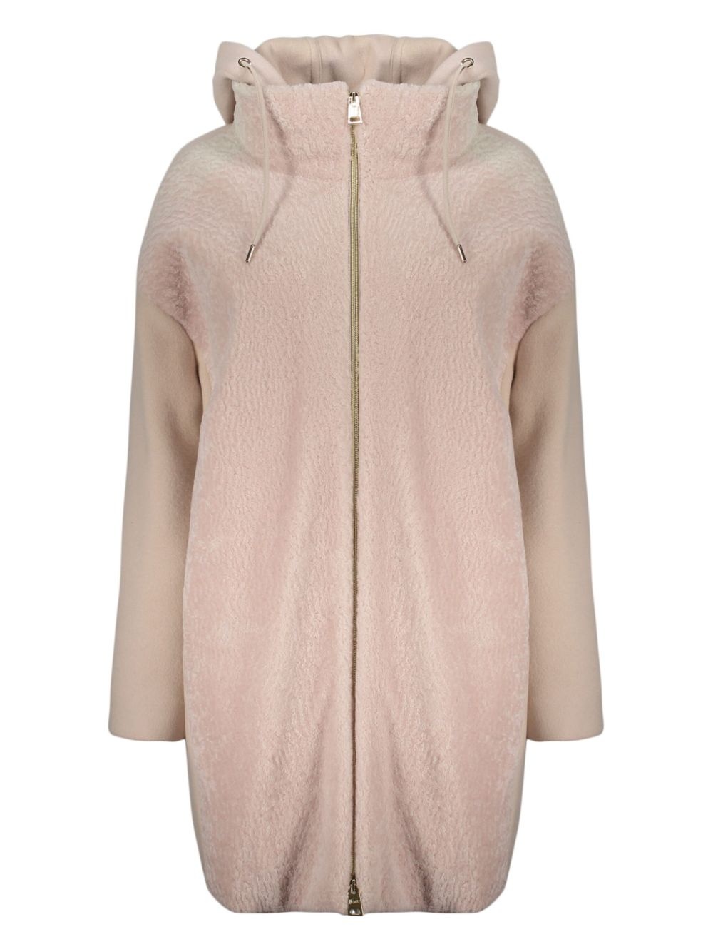 panelled coat Highlights - Light beige - Front two-way zip fastening - Drawstring hood - Drop shoulder - Long sleeves Made in Italy Composition Sheep Skin/Shearling 100%, Wool 78%, Cotton 55%, Polyester 45%, Polyamide 22%