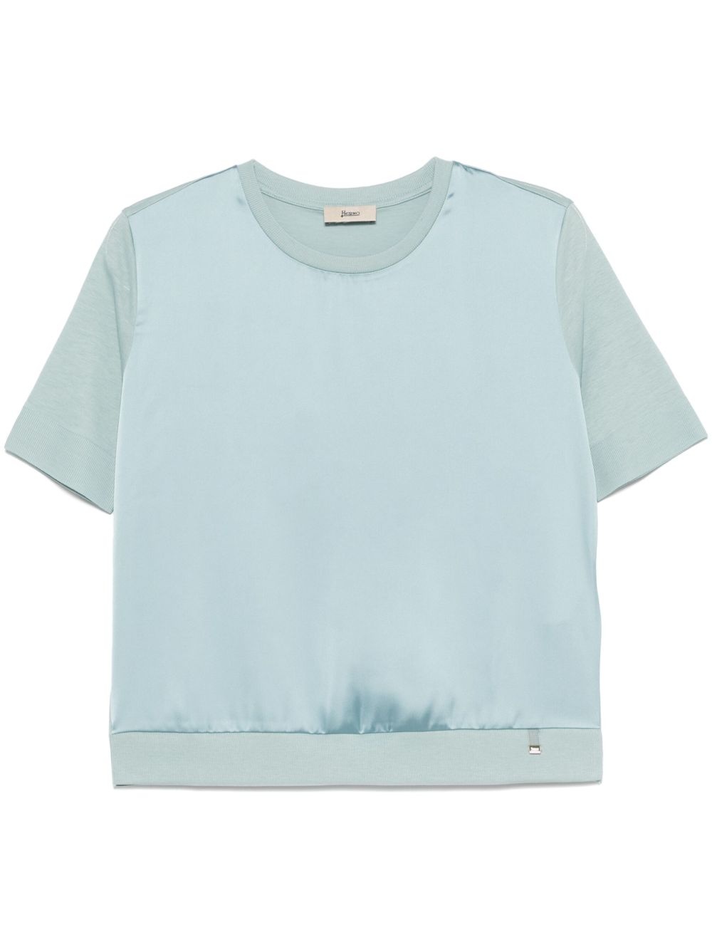 panelled T-shirt Highlights - Tiffany blue - Ribbed cuffs and hem - Silver-tone logo plaque - Crew neck Imported Composition Polyester 100%, Lyocell 67%, Cotton 33% SIZE & FIT Model measurements Height 5 ft 9 in(1.75 m) Bust/Chest 34.64 in(88 cm) Hips 36.61 in(93 cm) Waist 26.37 in(67 cm) FittingInformation Designed for a slim fit that sits just away from the body offering a close yet comfortable fit Made with a midweight knit, this piece offers some stretch