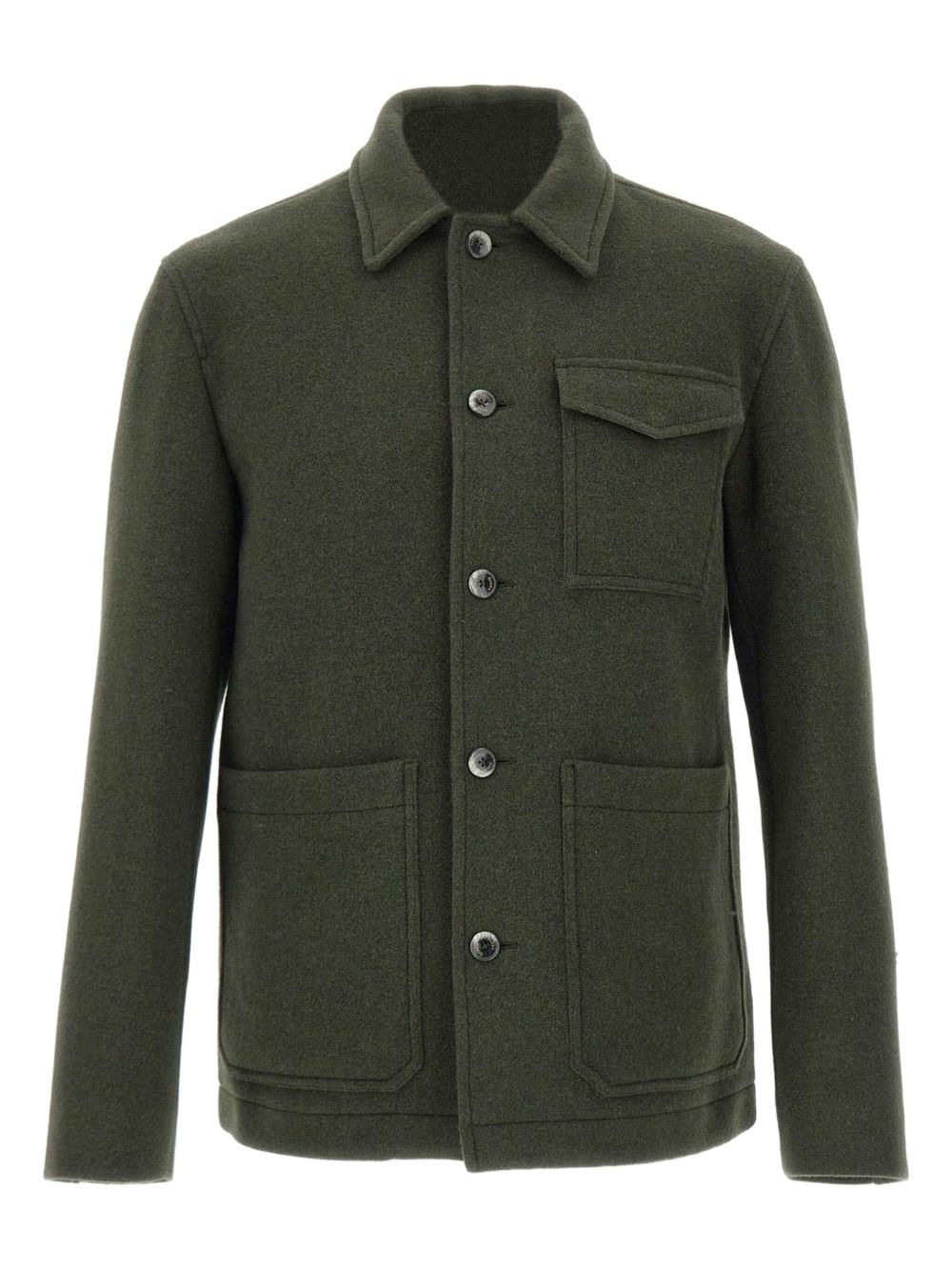 patch-pocket button-fastening shirt jacket Highlights - Green - Wool blend - Pointed collar - Logo button fastening - Front patch pockets - Chest pocket - Metal logo back Made in Italy Composition Wool 70%, Polyamide 27%, Fabric 3% Washing instructions Read Manufacturer Guidelines