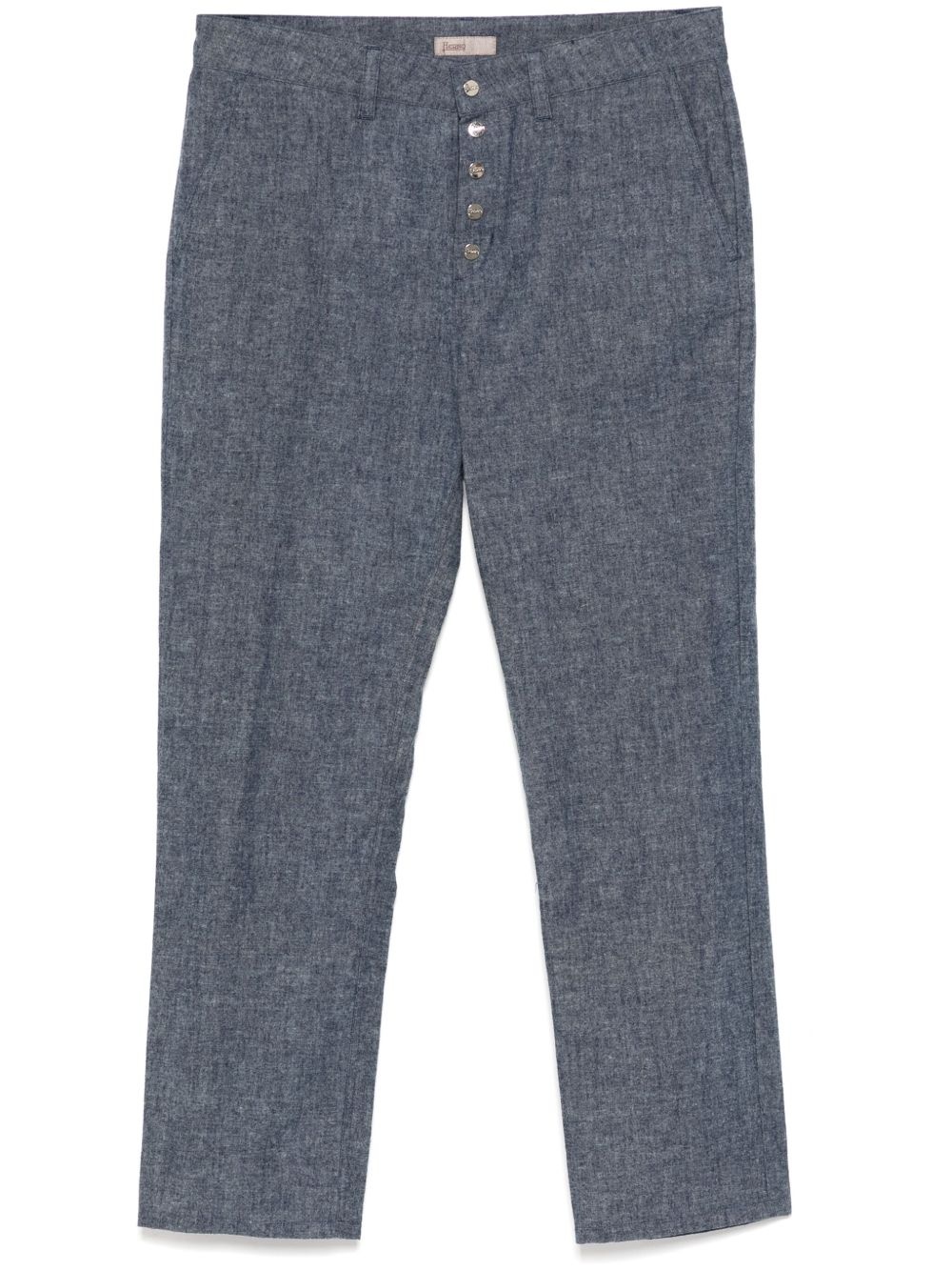 press-stud fastening jeans Highlights - Navy blue - Press-stud fastening - Two side slash pockets - Rear patch pockets Made in Italy Composition Cotton 100% SIZE & FIT Model measurements Height 5 ft 10 in(1.78 m) Bust/Chest 24.4 in(62 cm) Hips 35.43 in(90 cm) Waist 31.88 in(81 cm) FittingInformation Designed for a tapered fit, these trousers allow for a close fit at the waist and a loose unrestricted fit over the leg with a closer fit towards the ankle Made from a midweight non-stretch fabric