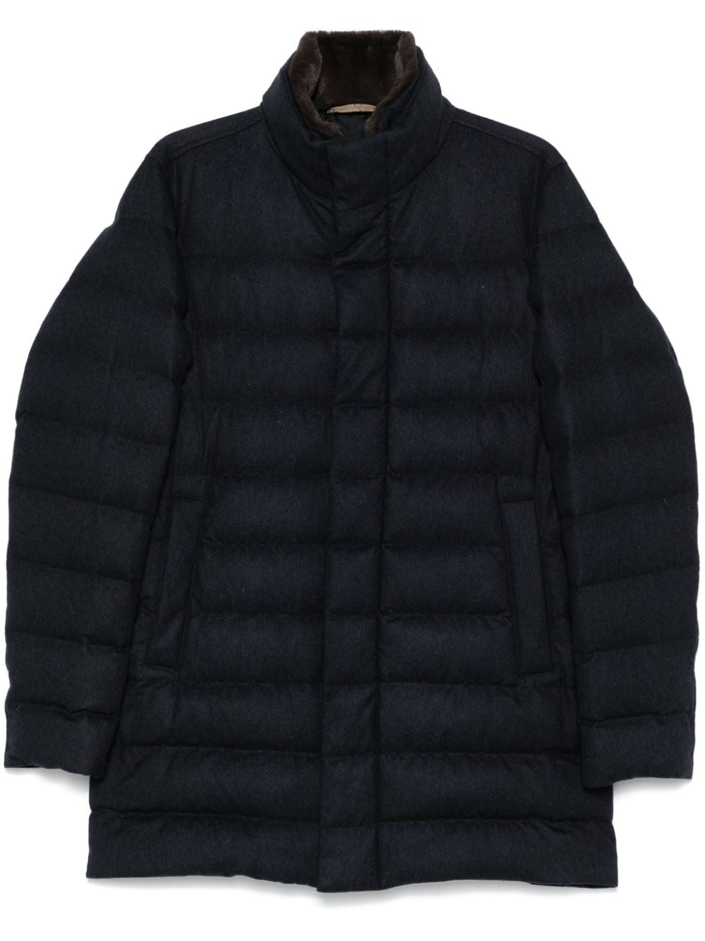 quilted coat Highlights - Midnight blue - Cashmere-silk blend - Down-feather filling - Quilted - Padded design - Water-repellent - Front press-stud and zip fastening - Detachable faux-fur collar - Long sleeves - Two side stud-fastening pockets - Full lining - Straight hem - Above-knee length Made in Italy Composition Outer: Polyester 100%, Polyurethane 100%, Silk 51%, Cashmere 49% Lining: Polyamide 100%, Goose Down 90%, Goose Feather 10% SIZE & FIT Model measurements Height 6 ft 1 in(1.85 m) Bust/Chest 35.82 in(91 cm) Hips 37.79 in(96 cm) Waist 29.13 in(74 cm) FittingInformation Designed to be unstructured, offering a loose fit throughout Made from a padded non-stretch fabric, giving it no natural elasticity Washing instructions Dry Clean Only