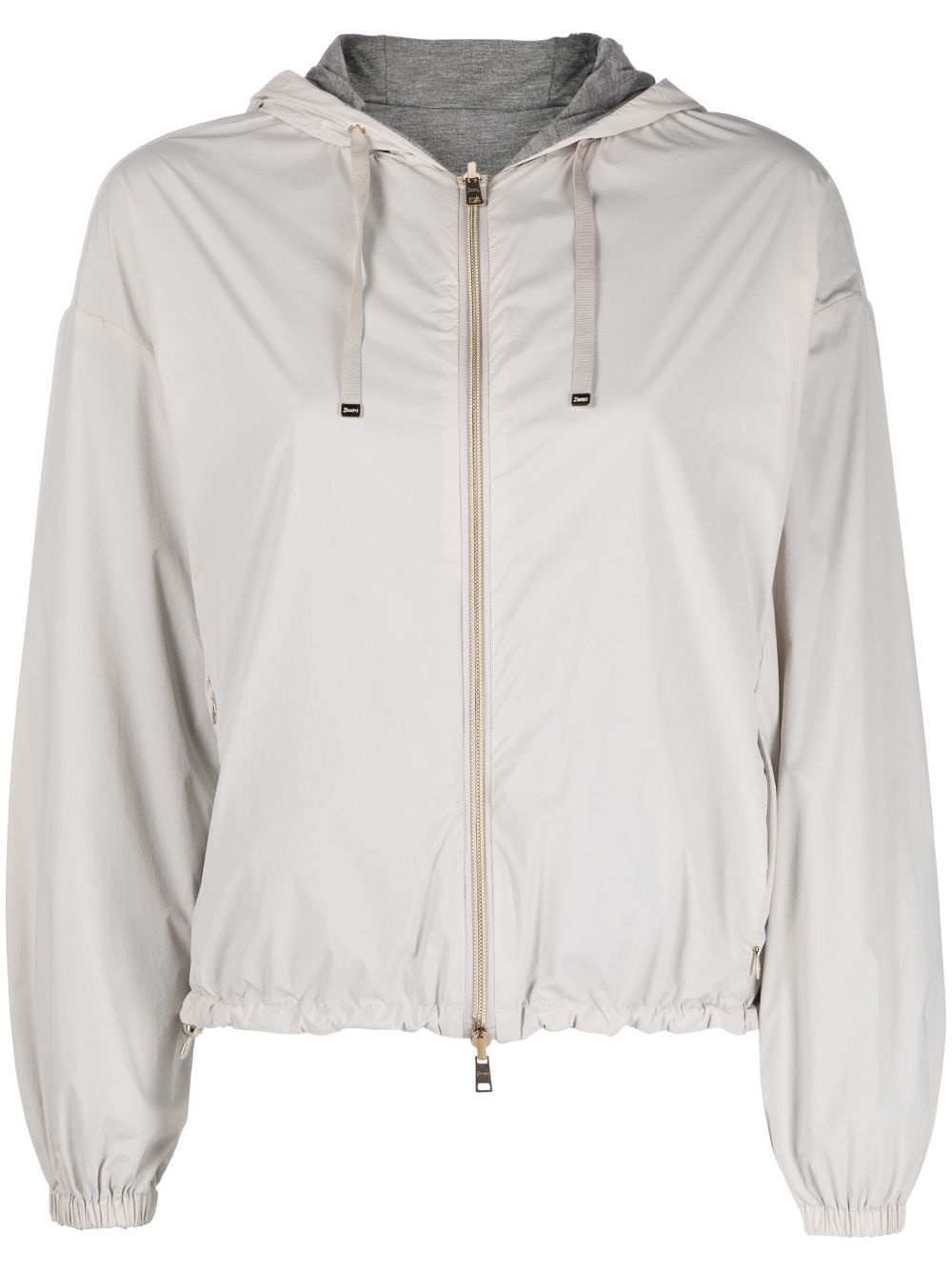 reversible hooded lightweight jacket Herno reassures the lightweight jacket with a sporty appeal with this zip-up hoodie silhouette. Featuring a reversible design for a touch of versatility, it’s monochromatic on one side and bi-tonal on the other. Highlights - Off-white/dark grey - Lightweight construction - Reversible - Drawstring hood - Front zip fastening - Long sleeves - Elasticated cuffs - Front pouch pocket - Rear zip-fastening pocket - Elasticated straight hem Made in Italy Composition Viscose 100%, Polyamide 86%, Elastane 14% SIZE & FIT Model measurements Height 5 ft 10 in(1.78 m) Bust/Chest 31.49 in(80 cm) Hips 35.03 in(89 cm) Waist 23.62 in(60 cm) FittingInformation Designed for a relaxed fit, this piece allows for comfort and movement when worn The internal drawstring at the hem allows for fitted preferences Made from a lightweight non-stretch fabric This piece fits true to size – take your usual size Washing instructions Dry Clean Only