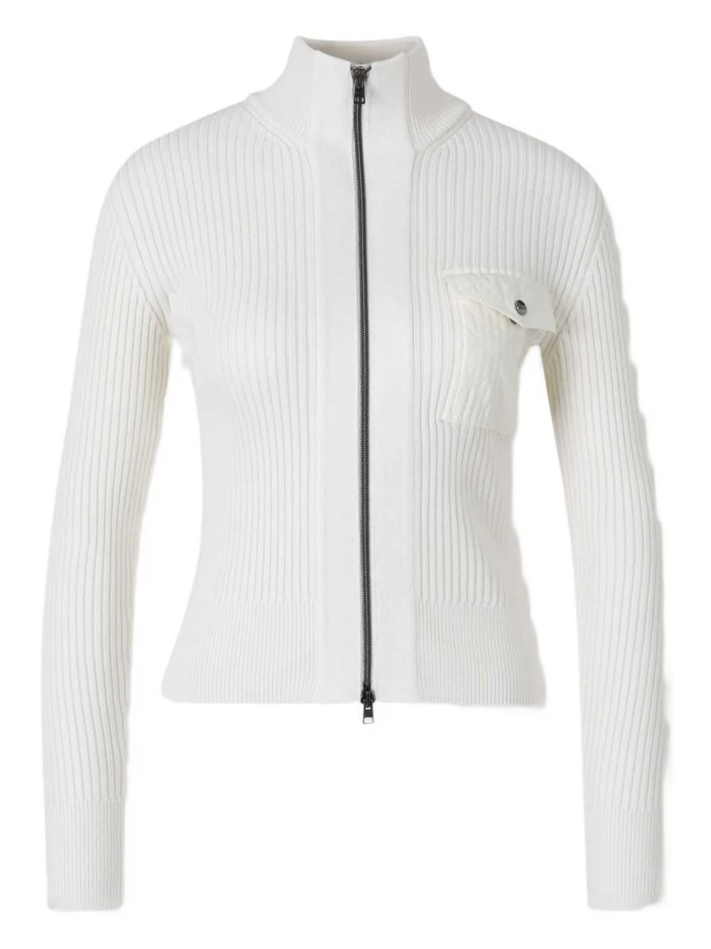 ribbed-knit cardigan Highlights - White - Ribbed knit - Front zip fastening - Quilted pocket - High neck - Long sleeves Made in Italy Composition Wool 80%, Polyamide 20% Washing instructions Read Manufacturer Guidelines