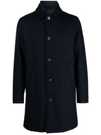 single-breasted layered coat Highlights - Navy blue - Virgin wool - Layered design - Classic collar - Front button fastening - Long sleeves - Two side inset pockets - Mid-length - Straight hem Made in Italy Composition Outer: Virgin Wool 100%, Polyurethane 100%, Polyester 100% Lining: Polyamide 100%, Polyester 100% SIZE & FIT Model measurements Height 6 ft 1 in(1.85 m) Bust/Chest 35.43 in(90 cm) Hips 35.82 in(91 cm) Waist 27.55 in(70 cm) FittingInformation Designed to be unstructured, offering a loose fit throughout The detachable panel offers the preference for a different fit Made from a midweight non-stretch fabric This piece fits true to size – take your usual size Measurement CHEST 45.27 in(115 cm) SLEEVE LENGTH 34.25 in(87 cm) WAIST 44.88 in(114 cm) Shoulder Width 17.71 in(45 cm)