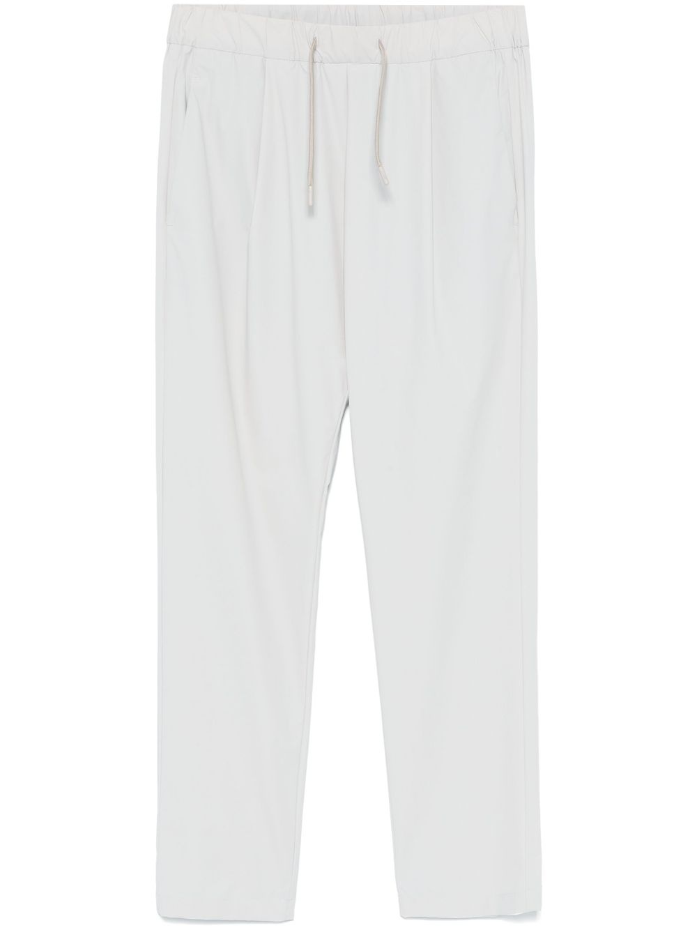 tapered track pants Highlights - Light grey - Elasticated drawstring waistband - Two side slash pockets - Pleat detailing Imported Composition Outer: Polyamide 78%, Elastane 22% Lining: Polyester 100% SIZE & FIT Model measurements Height 5 ft 10 in(1.79 m) Bust/Chest 31.88 in(81 cm) Hips 35.43 in(90 cm) Waist 23.62 in(60 cm) FittingInformation Designed for a relaxed tapered cut, these trousers allow for a close fit at the waist and offer a loose fit at the thighs, with a closer fit toward the ankles The elasticated waist allows for a comfortable fit Made from a lightweight stretch fabric, this piece offers elasticity and flexibility when worn