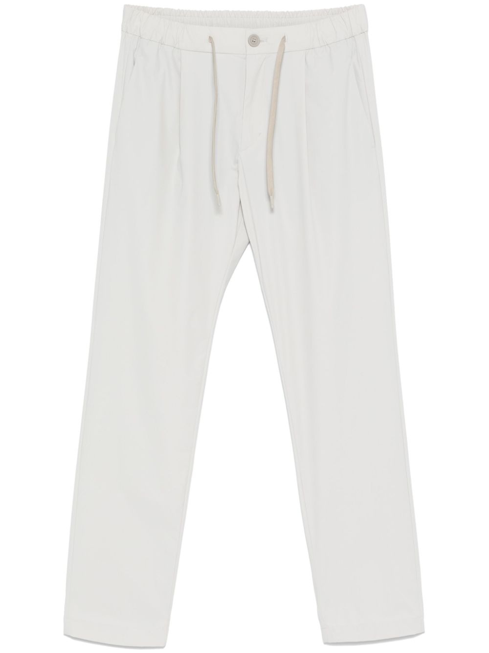 tapered trousers Highlights - Light grey - Concealed fly and button fastening - Elasticated drawstring waistband - Two diagonal pockets to the sides - Two rear jetted pockets Imported Composition Lining: Polyester 100% Outer: Polyamide 78%, Elastane 22% SIZE & FIT Model measurements Height 6 ft 2 in(1.87 m) Bust/Chest 38.18 in(97 cm) Hips 36.61 in(93 cm) Waist 29.13 in(74 cm) FittingInformation Designed for a relaxed tapered leg, allowing a comfortable loose fit above the knee with a closer fit towards the calves The elasticated waist allows for a comfortable fit Made from a lightweight stretch fabric, this piece offers elasticity and flexibility when worn Washing instructions Machine Wash