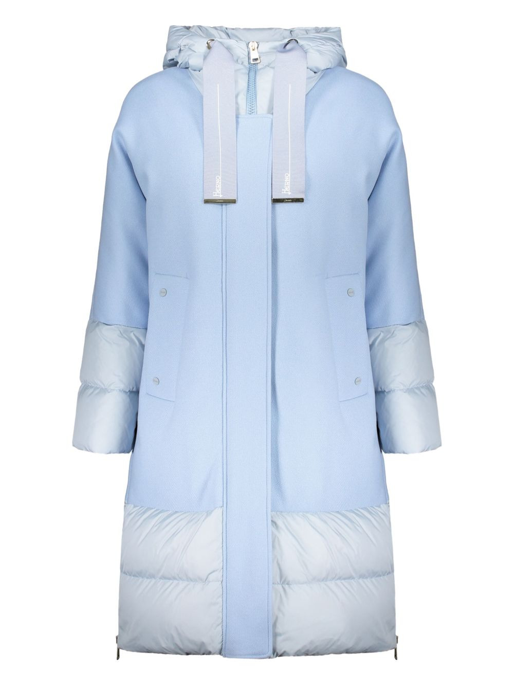 two-tone hooded puffer jacket Highlights - Light blue - Stand-up collar - Two front pockets - Zip fastening Made in Italy Composition Lining: Down 80%, Goose Feather 20% Outer: Virgin Wool 75%, Polyamide 25% Polyamide 100%, Polyester 100% Washing instructions Read Manufacturer Guidelines