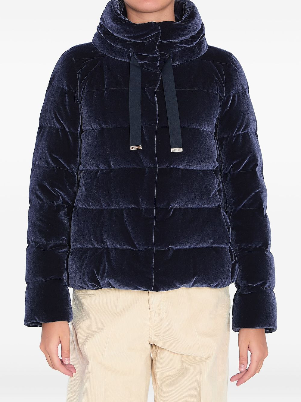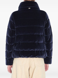 velvet quilted jacket Highlights - Dark blue - Quilted design - High drawstring collar - Concealed front fastening - Side pockets Imported Composition Polyester 90%, Elastane 10% Washing instructions Read Manufacturer Guidelines