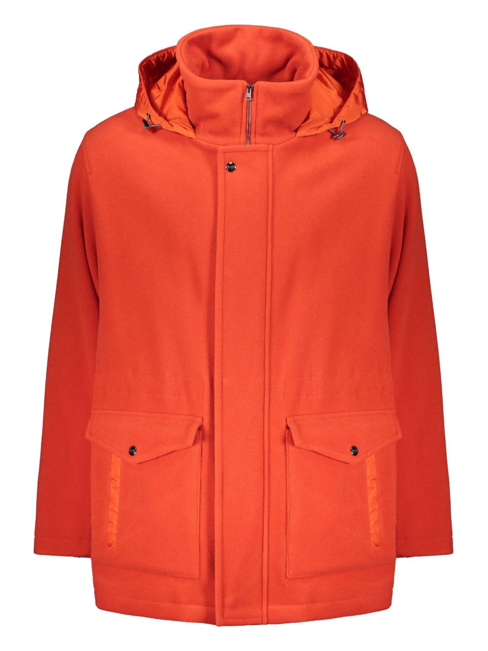 wool parka coat Highlights - Burnt orange - Front press-stud and zip fastening - Drawstring hood - Two front flap pockets - Internal drawstring fastening waist Made in Italy Composition Lining: Polyester 100% Outer: Polyamide 100%, Polyester 100%, Wool 100%