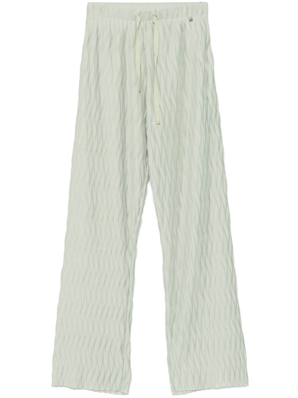 wrinkled-effect trousers Highlights - Light green - Elasticated drawstring waistband - Two side inset pockets - Gold-tone logo plaque Imported Composition Polyester 100% SIZE & FIT Model measurements Height 5 ft 9 in(1.75 m) Bust/Chest 34.64 in(88 cm) Hips 36.61 in(93 cm) Waist 26.37 in(67 cm) FittingInformation Designed for a straight-leg fit, these trousers allow for a close fit at the waist and an unrestricted, comfortable fit over the leg Adjust this piece’s waistband to your preference using the drawstring Made with a midweight knit, this piece offers some stretch