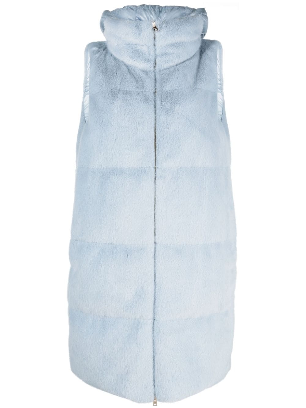 zip-up faux-fur hooded gilet Highlights - Celeste blue - Feather down - Faux-fur design - Padded design - Classic hood - Funnel neck - Front two-way zip fastening - Sleeveless - Two side inset pockets - Knee-length Imported Composition Outer: Polyester 100%, Polyamide 100% Lining: Polyamide 100%, Feather Down 100% SIZE & FIT Model measurements Height 5 ft 9 in(1.75 m) Bust/Chest 31.49 in(80 cm) Hips 34.05 in(86.5 cm) Waist 24.21 in(61.5 cm) FittingInformation Designed for a boxy fit, intended for a loose fit throughout Made from a padded non-stretch fabric, giving it no natural elasticity This piece fits true to size – take your usual size Washing instructions Dry Clean Only