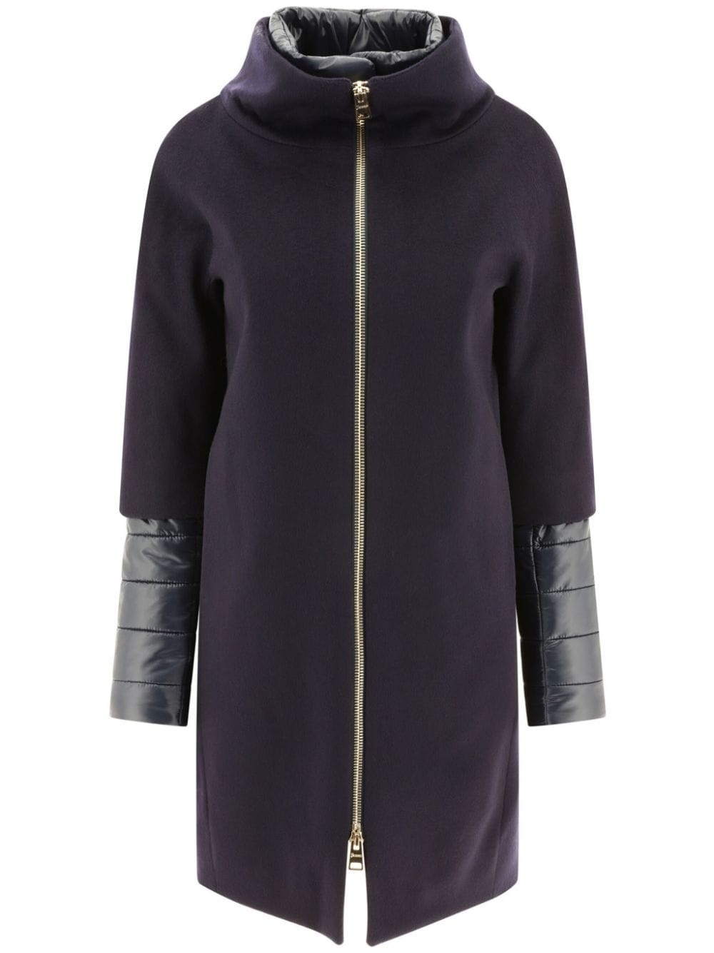 zip-up virgin wool coat Highlights - Midnight blue - Virgin wool - Quilted panels - Layered design - High neck - Front two-way zip fastening - Long raglan sleeves - High-low hem - Mid-length - Full lining Made in Italy Composition Polyamide 100%, Virgin Wool 100% SIZE & FIT FittingInformation Designed to be unstructured, offering a loose fit throughout The detachable panel offers the preference for a different fit Made from a midweight non-stretch fabric This piece fits true to size – take your usual size